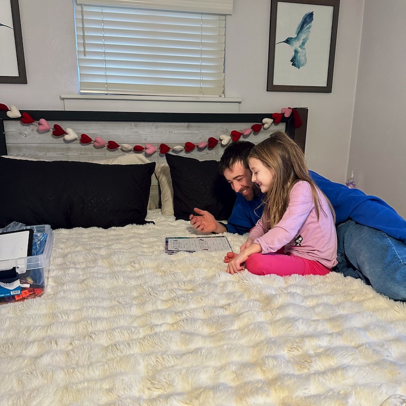 Because we were at the library for a while, we didn’t get to Sadie’s schoolwork until late afternoon (yay for homeschool flexibility!). It worked out well because Jimmy was able to go over her math with her when he got home from work! She always enjoys when daddy can be involved with her learning.