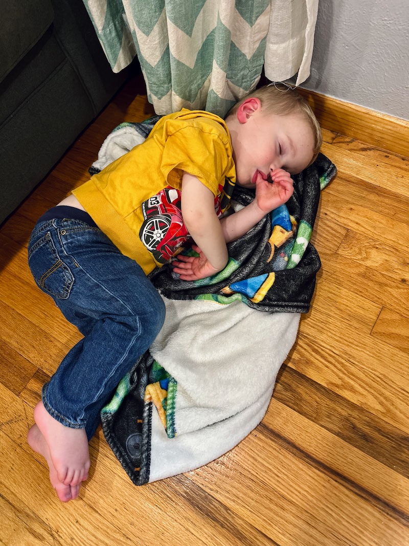 Mordecai is still in that weird in-between needing a nap and not needing a nap phase so he sometimes randomly falls asleep on the floor at 3:00 pm.