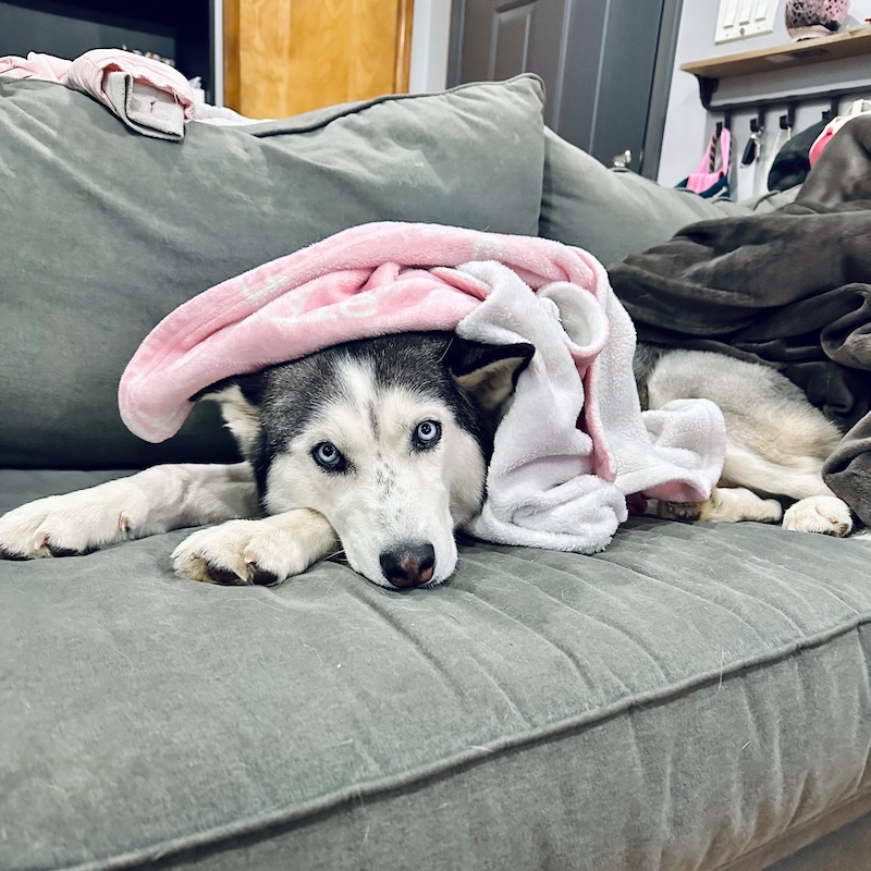 Niva snuggled up on the couch under Sadie’s blanket!
