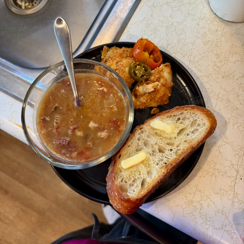2. Our family friend and neighbor, Bernadette, gave us homemade bean soup and sourdough! I paired it with spicy chicken it and was the perfect warm meal on a cold night. Thank you, Bernadette!