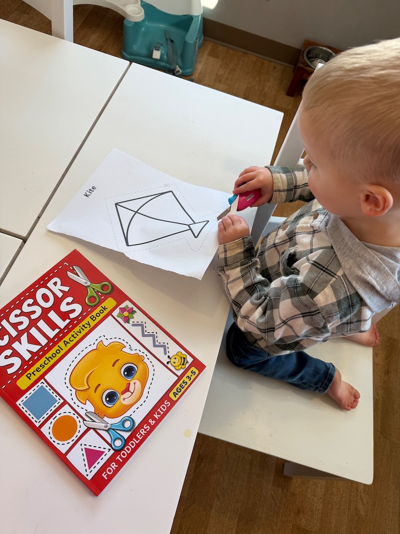 3. Mordecai using scissors! He loves to cut pages from this workbook and use these cool toddler scissors.
