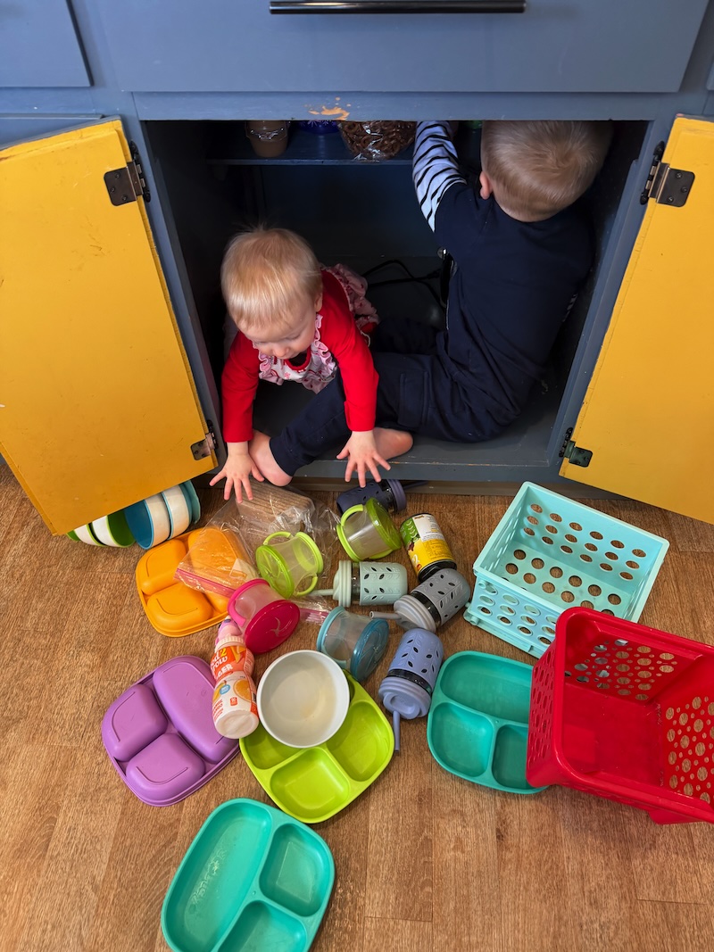Mordecai and Dakota got into some trouble in our cabinet! They dumped everything out while I was doing a math lesson with Sadie. Ya win some, ya lose some! Also, those divided plates? We’ve had those since Sadie was a baby and they’ve held up so well.