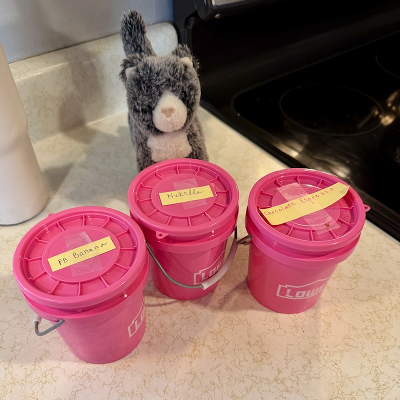 I made some overnight oats in mini Lowe’s buckets for my sis (with Mordecai’s stuffed cat overseeing the process). I realized I’ve never shared my base overnight oats recipe here on the blog. I need to do that soon! I love coming up with different flavor variations.