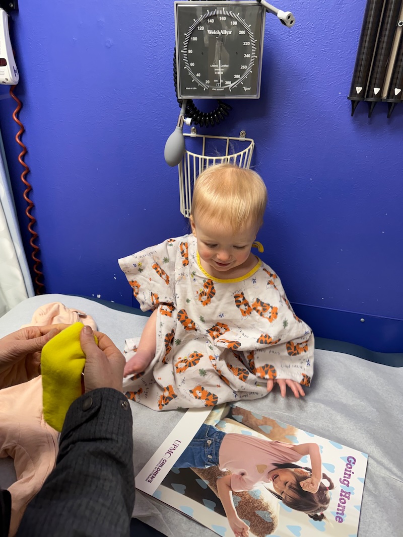 The nurse went over all the discharge paperwork with us while Dakota cried. We gave her a granola bar and she perked up a little bit! I’m sure she was a bit hangry, haha.