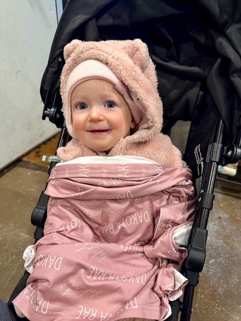 Then it was back to cold weather, so Dakota got bundled up like a mummy for our walk!
