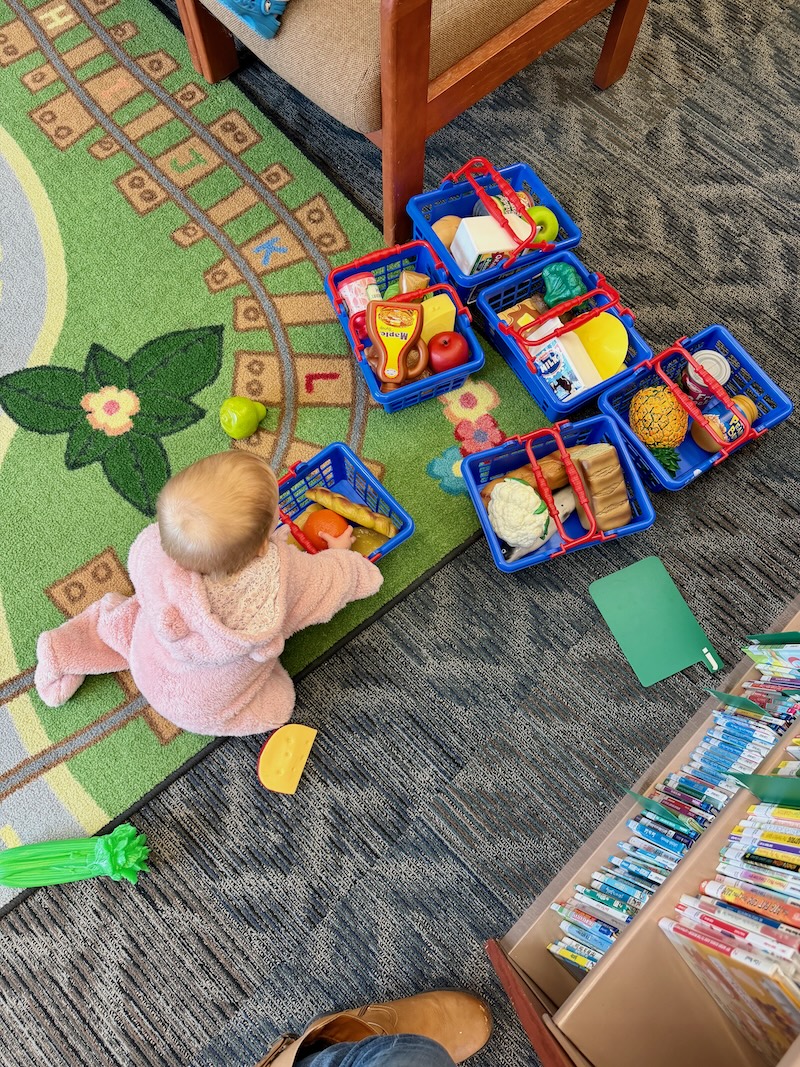 We also went to the library. Our happy place! Mordecai said he set up a market for Dakota to play with.