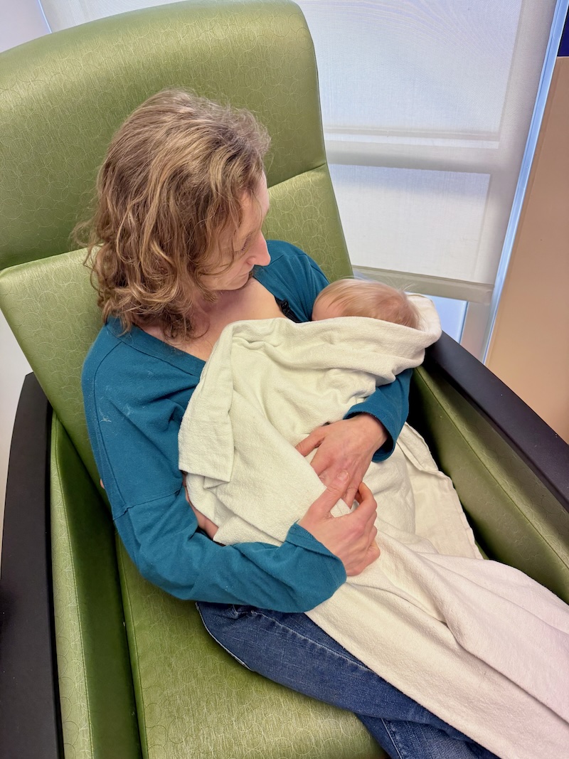 A little later, we were ushered back to a room where a nurse was holding a very upset and very out of it Dakota. It was so weird to see someone we had never met holding her after a surgery. She was in such good hands, though! I was able to immediately breastfeed her and comfort her.