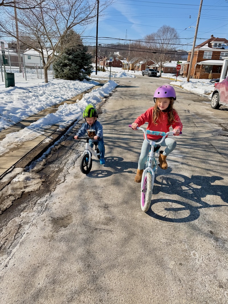 Of course, we had to get outside on a bike ride/walk! Without gloves or jackets. Swoon! It was bizarre to see sunshine and mounds of snow at the same time. 😂