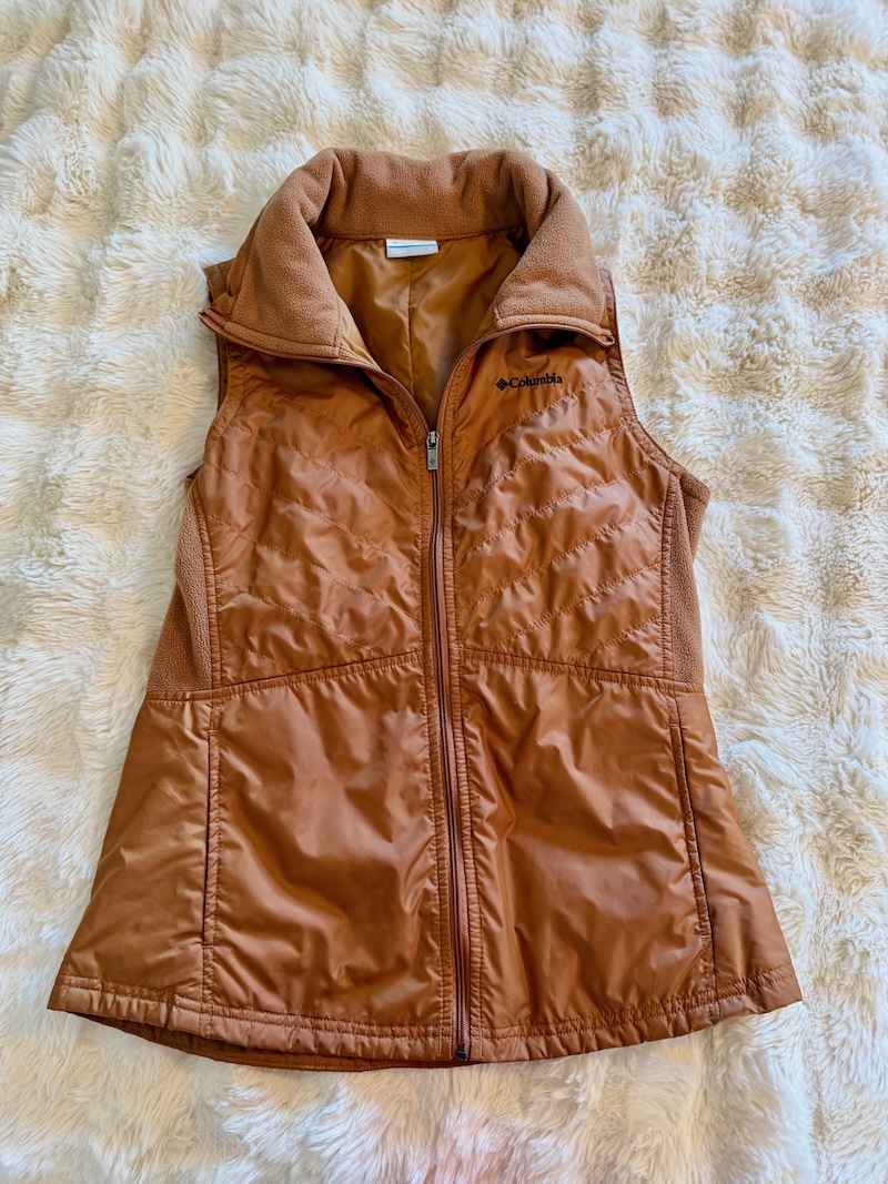 If you know me in real life, you’ve probably seen me wear this Columbia vest way, way too often. In fact, I have it in three colors. That’s how warm, comfortable, and versatile it is.