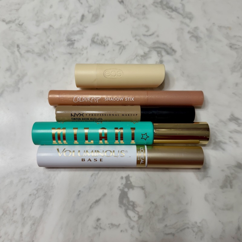 EOS Lip Balm | ColourPop Shadow Stix | NYX Brow Mascara | Milani Tubing Mascara | L’Oreal Lash Primer