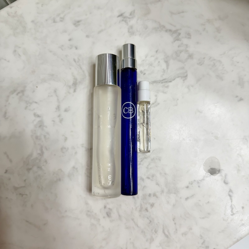 Perfumes sitting on bathroom countertop
