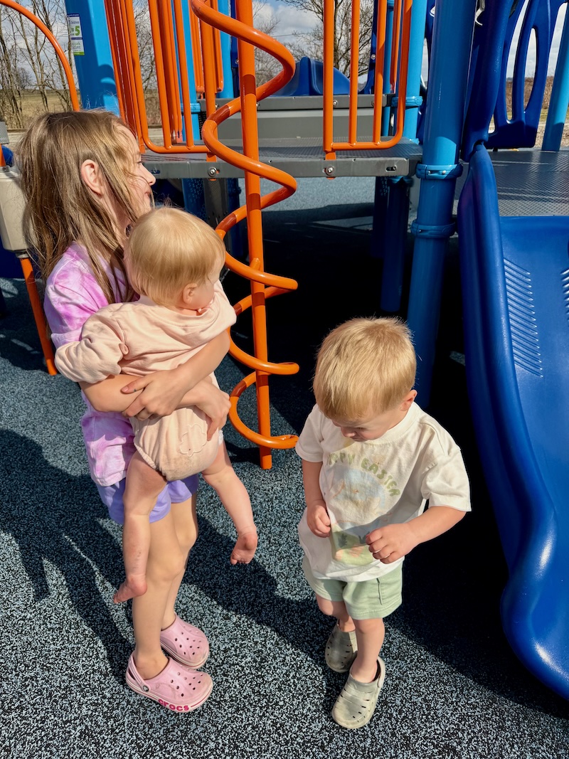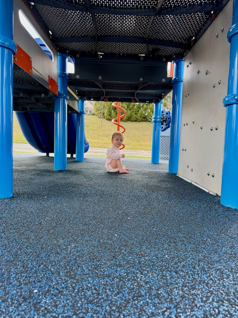 We went to the playground and Dakota parked herself under the play structure for a bit. It wasn’t long before she was climbing the steepest steps and made her way onto a bench all by herself. Helpppp!