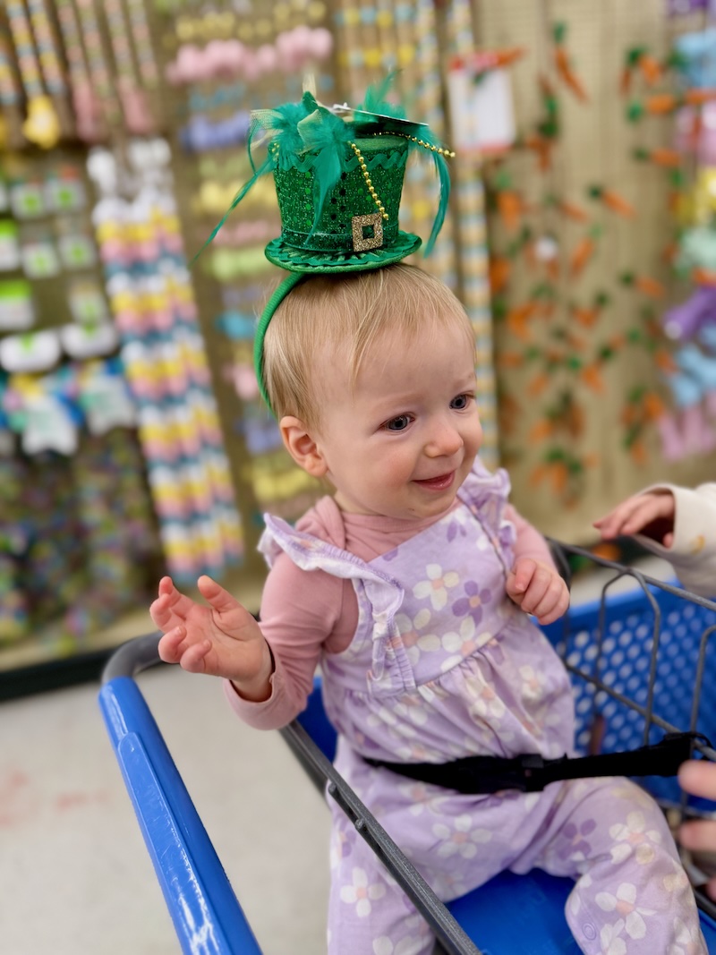 Baby girl wearing leprechaun hat in Hobby Lobby