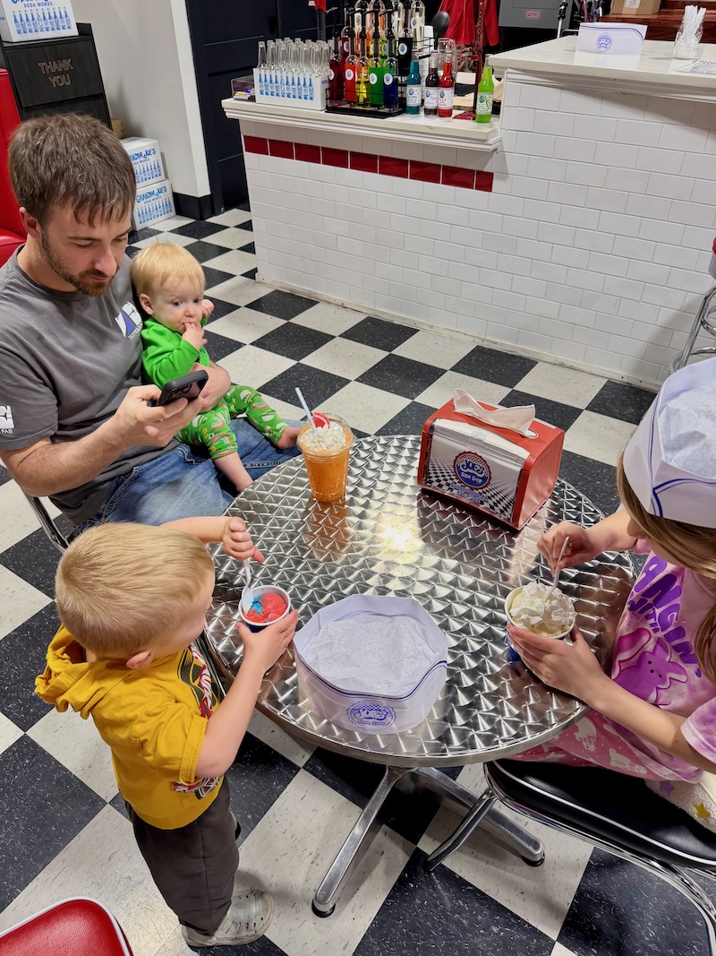 Dad and kids in Joe's Soda Shop in Canonsburg