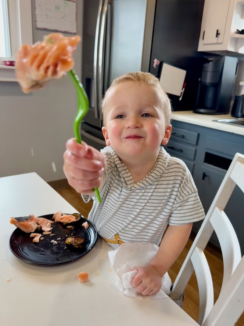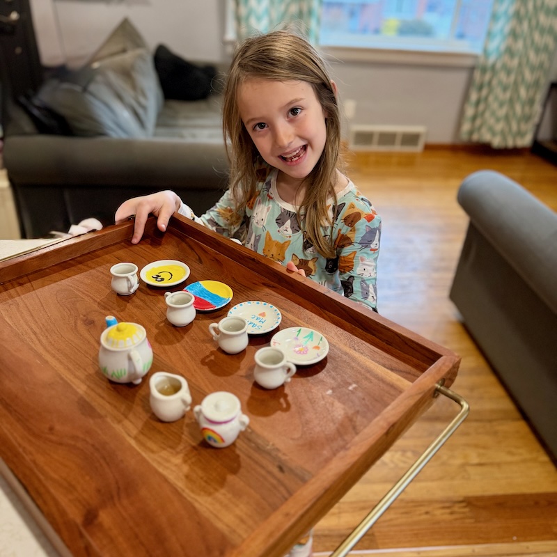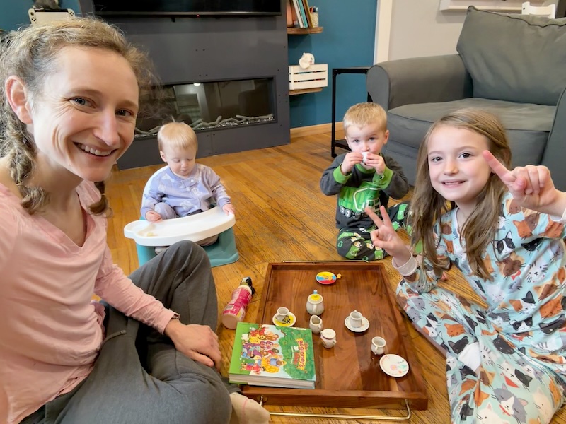 We read the Bible story about the loaves and fishes while we snacked on Goldfish. We had to keep Dakota in her booster seat so she didn’t break any tea cups. 🤣