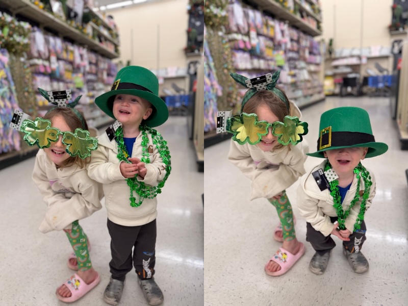 Kids wearing St. Patrick's Day accessories in Hobby Lobby