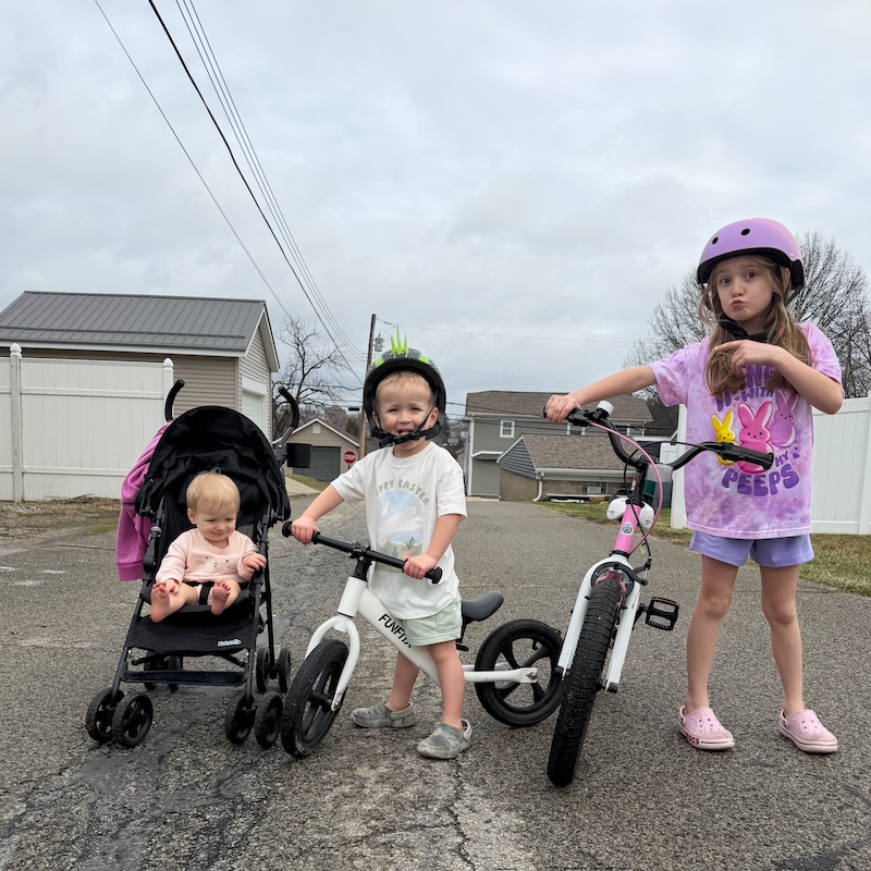 1. I love all the pics! My fav is the three of them lined on the bikes and Dakota in the stroller.