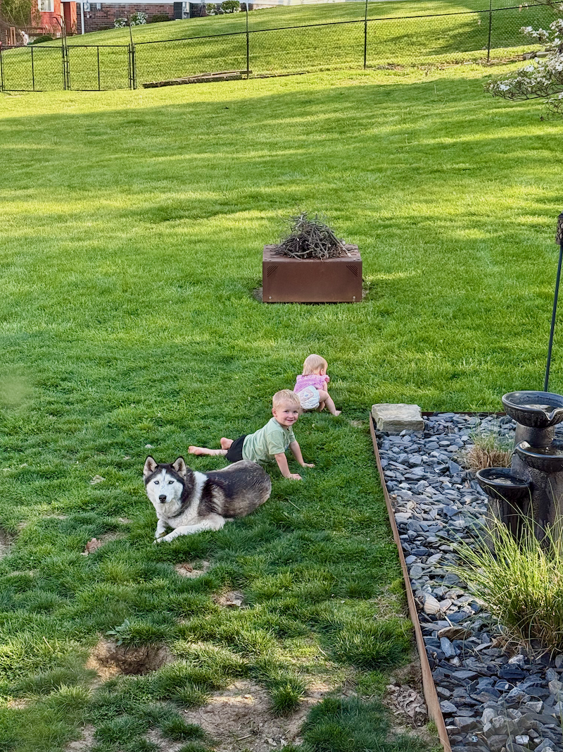 Toddler, baby, and husky in yard