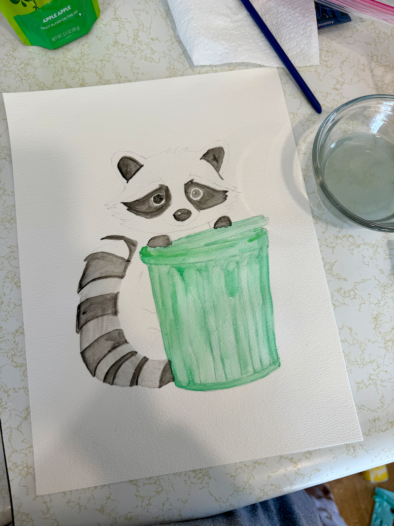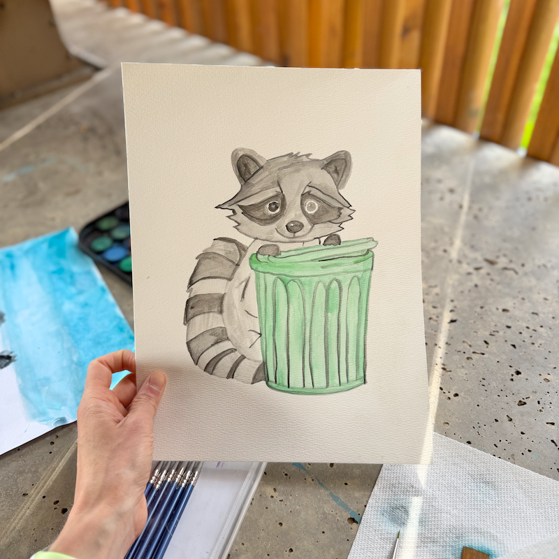 Raccoon with garbage can watercolor