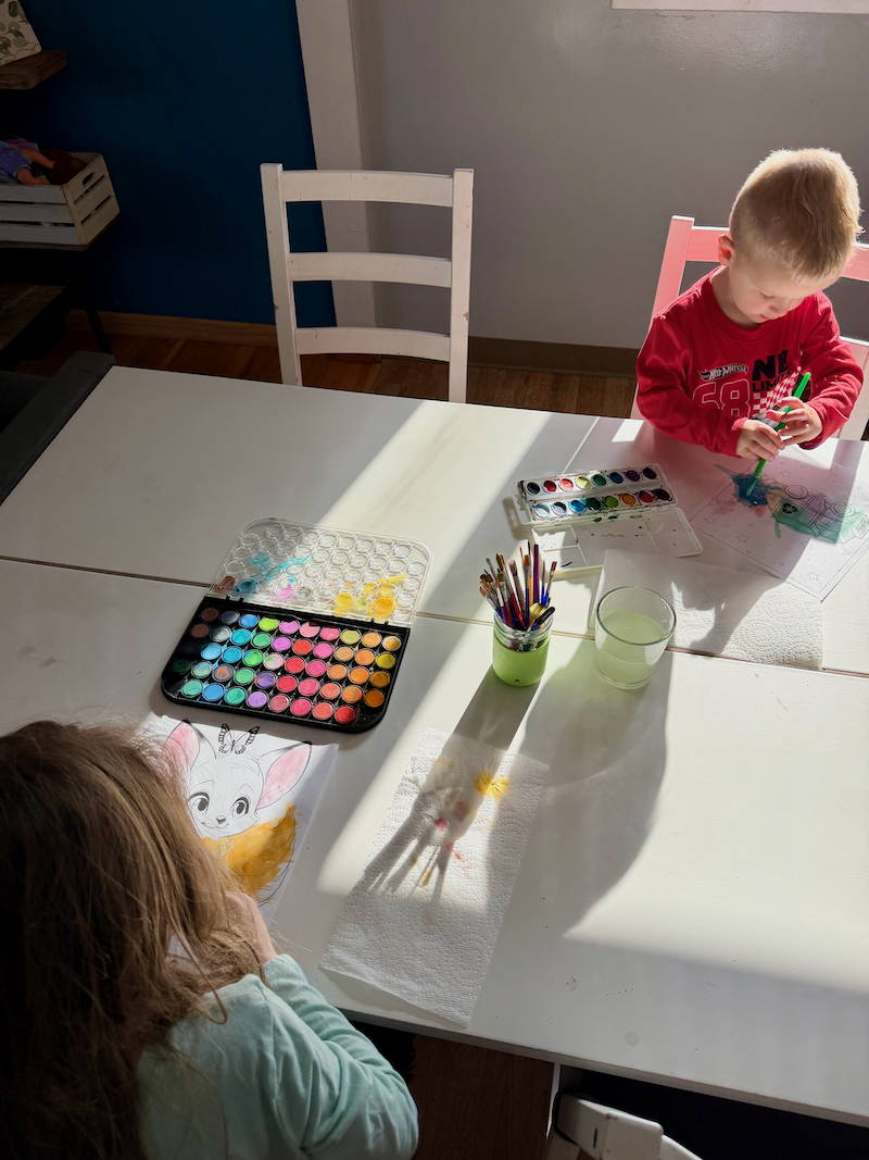 Kids sitting at kitchen table watercoloring