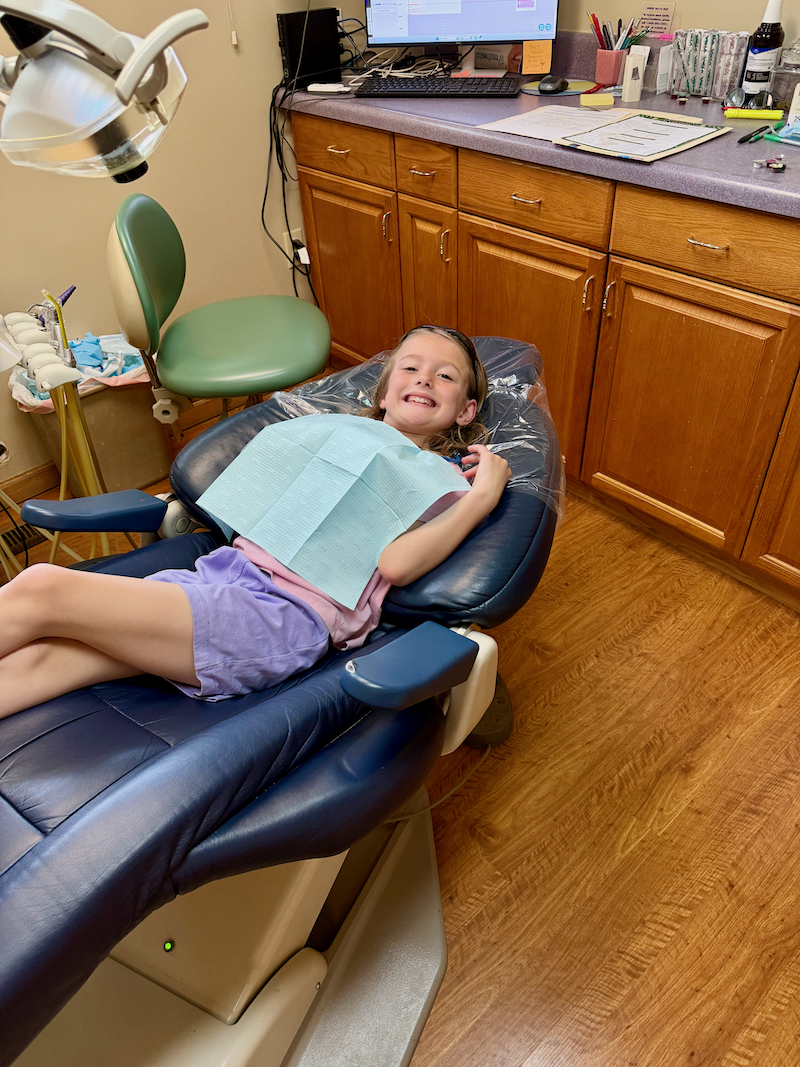 Girl at dentist in chair smiling