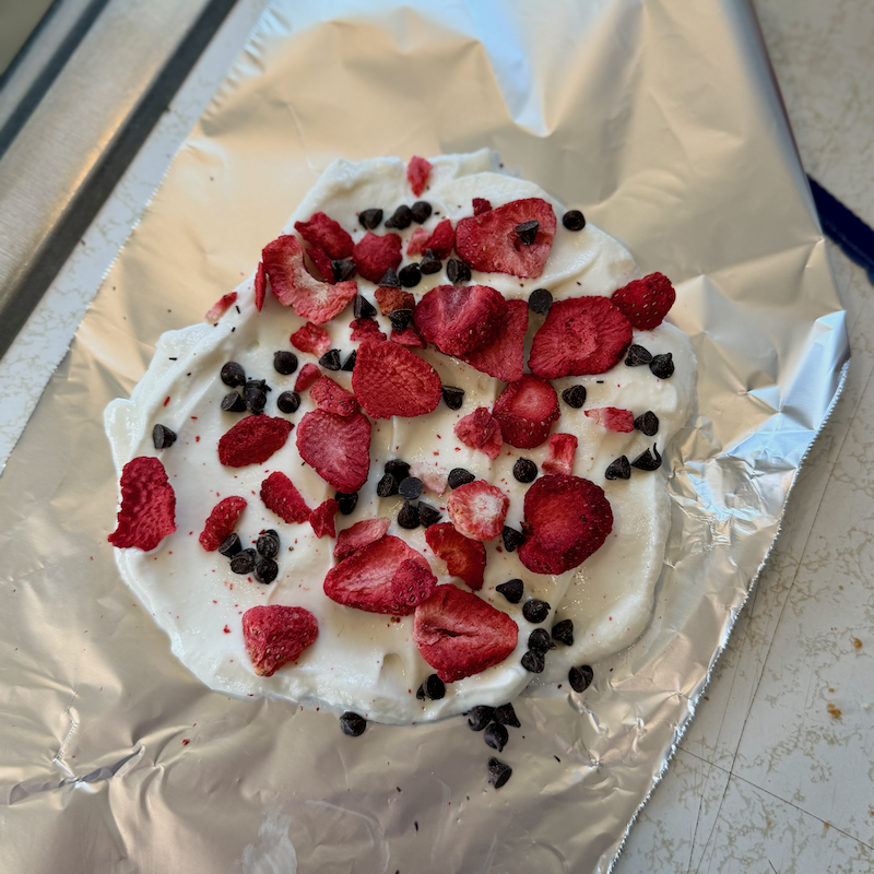 The next thing the kids tried was a hit! I spread vanilla whole milk yogurt onto foil, topped it with freeze dried strawberries and mini chocolate chips and froze it for a few hours. I then broke it into chunks for them to snack on! We called it yogurt bark. 😊