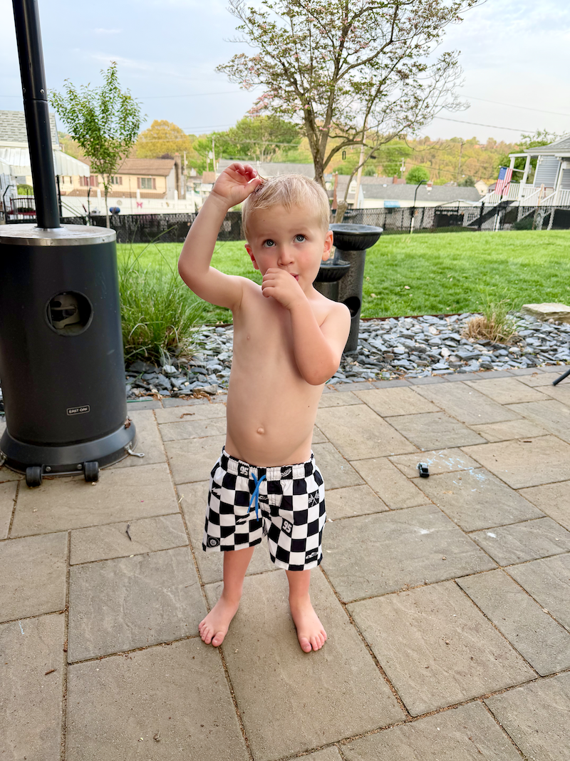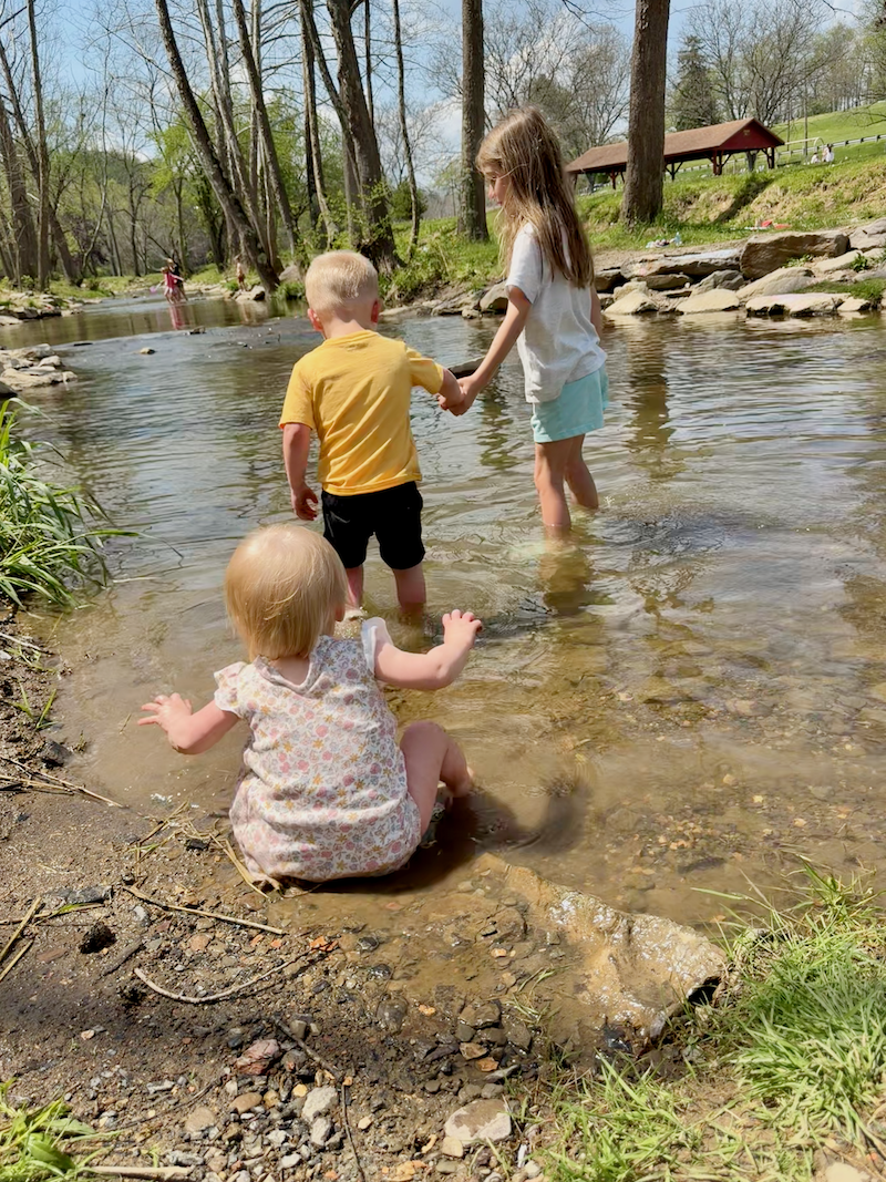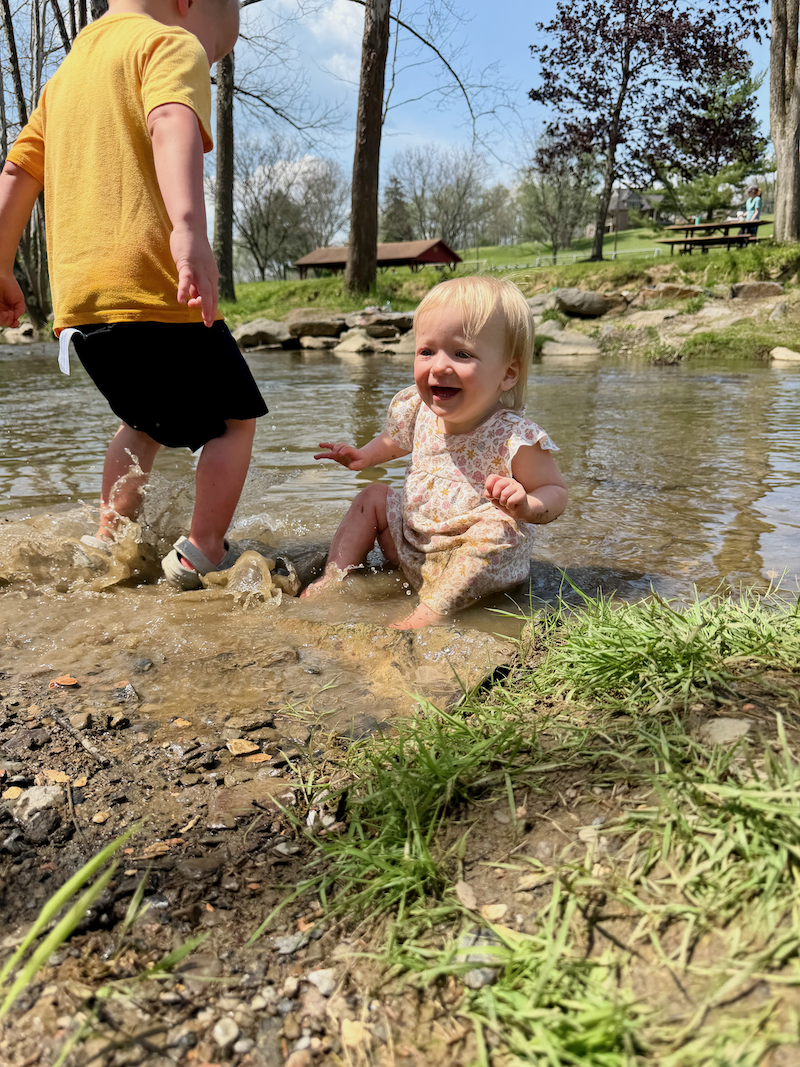 After the kids were nice and hot, we decided to head over to the creek so they could dip their toes in the water. I was so unprepared for this, though. I should have packed swimsuits because Dakota immediately plopped right down in the water and Mordecai fell in!