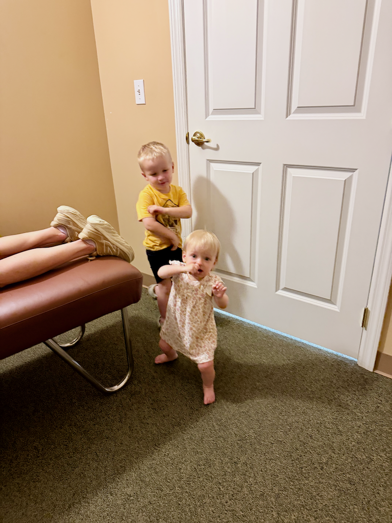 Once everyone was all sugared up, we went to the chiropractor. Have you ever taken three kids to the chiropractor? It’s chaotic! Sadie took this picture and it accurately sums up our experience. Me laying on the table and the littles roaming around the room looking for trouble. 😉