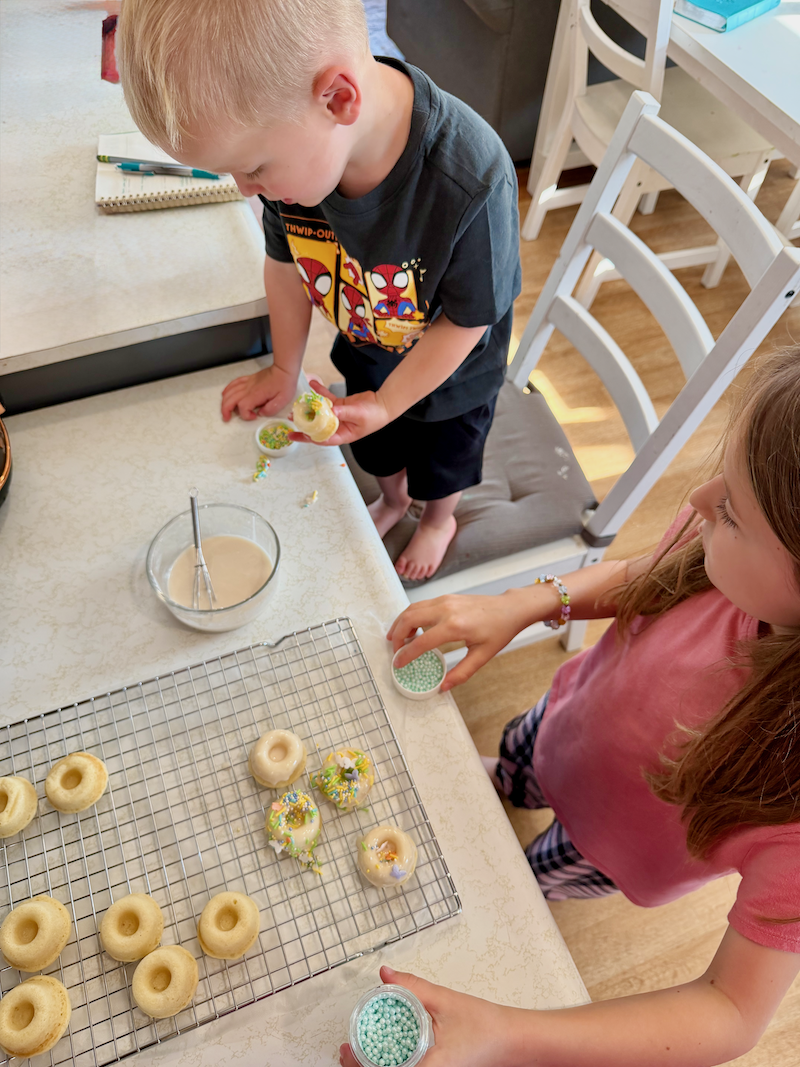 I learned not to fill the cavities with too much dough because the first batch ended up looking more like tiny bundt cakes than donuts. The kids didn’t mind, though! They were just excited to use sprinkles to decorate.