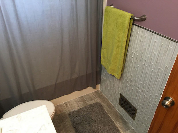 We only have a few more finishing touches to do, which include a possible second coat of paint, purchasing a toothbrush holder, and installing a new fan. It’s really starting to come together! I’m glad we went with the green/purple/gray color theme. It feels like a mix of calm and energizing and nature all in one. That totally made sense, right?