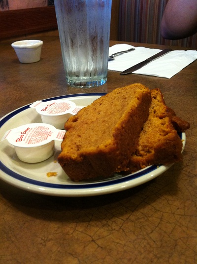 Bob Evan’s pumpkin bread. Jimmy and I have spent the past 3 or 4 Friday night’s eating dinner at Bob Evans. I pretty much go just for the pumpkin bread. Just kidding, the food there is pretty good. But the pumpkin bread is really good.