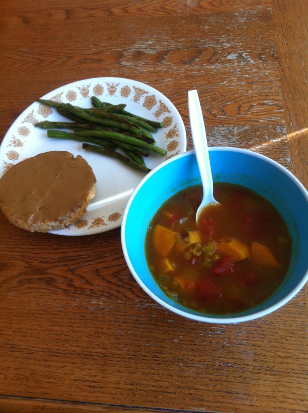Sweet potato-lentil soup + rice cake w/ SSB + green beans