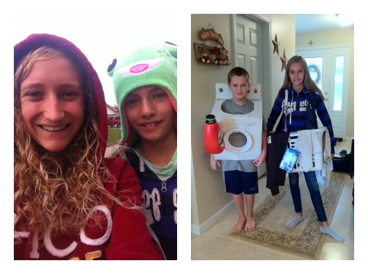 The photo on the left was before we took a walk. The photo on the right is the younger kiddos in their Halloween costumes. They were a washer and laundry basket. How creative is that?!