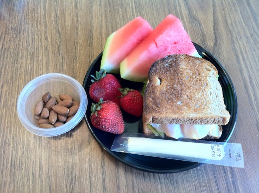 Cute lil lunch. Turkey sandwich, cheese stick, fruit & almonds.