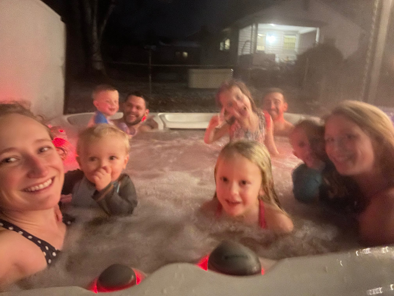 We hit two new records with our hot tub lately: most people we’ve ever had in it and coldest weather we’ve experienced while using it!
