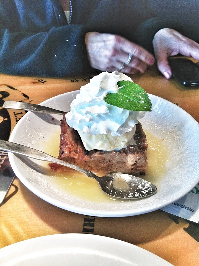 Bread pudding with ice cream and whipped cream.