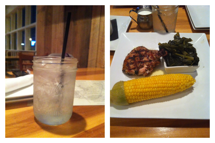 Dinner from PCI Bar & Grill. I got collard greens, corn on the cob, and herb roasted chicken. I loved that my drink came in a mason jar. Very cute.