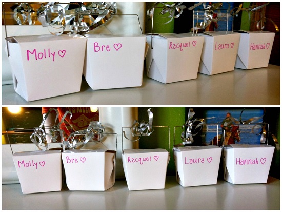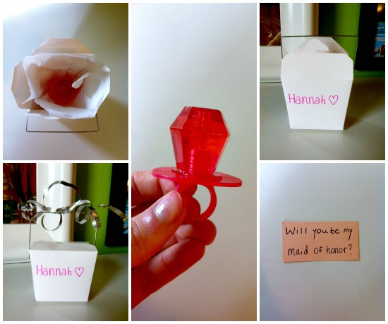 After doing some thinking and Pinterest research, I decided to present each girl with a Ring Pop. I had originally planned on giving them the rings in ring boxes from a craft store, but my local craft store was all out of ring boxes. So, I improvised with mini Chinese food boxes.