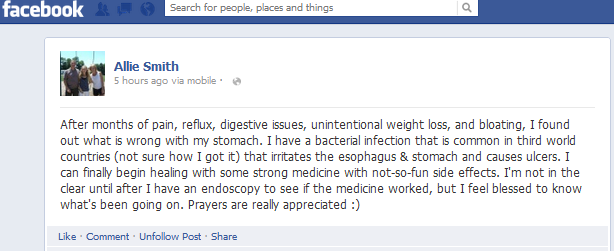 Edited to add: If you want to talk to me about my experience with H. Pylori and the medicine I took, please feel free to email me at allie(at)southboundenterprises(dot)com. Thanks!