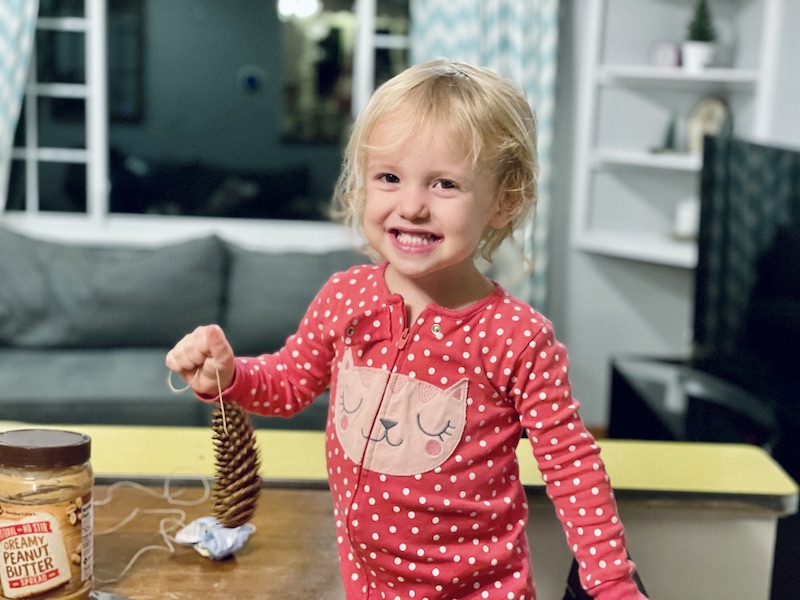 We tied twine around the pinecones, covered them with peanut butter, and rolled them in bird seed. It was definitely messy–I’m pretty sure I’ll be cleaning a mixture of bird seed and peanut butter off of every kitchen surface for a few weeks–but a ton of fun!
