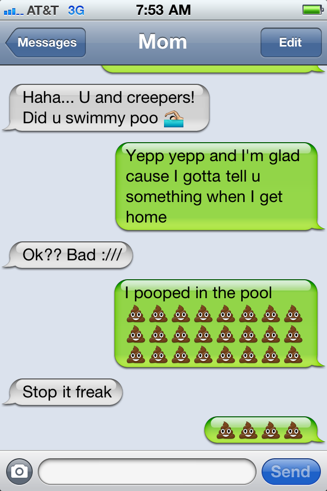 My sister downloaded an application so that my mom and I can use emoticons when texting. I got a little carried away… I’m the text that is green colored.