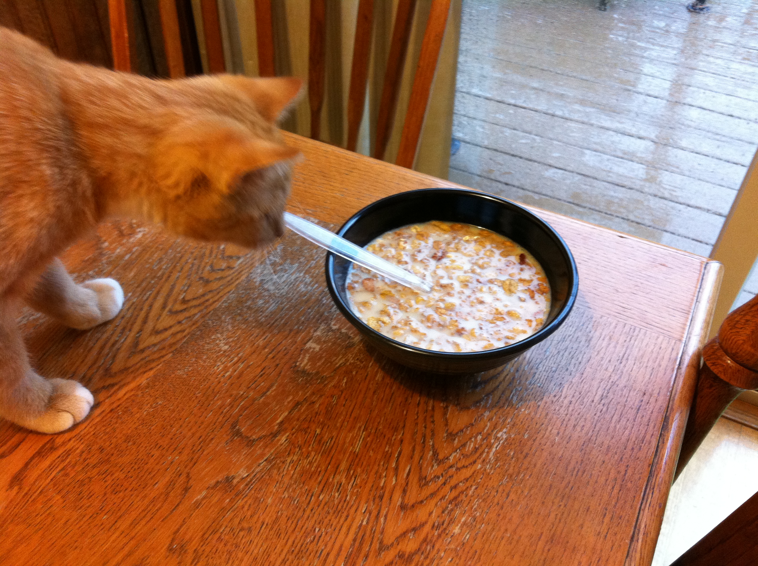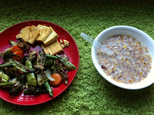 A strange meal… roasted veggies in olive oil, baked tofu, and cereal with rice milk.