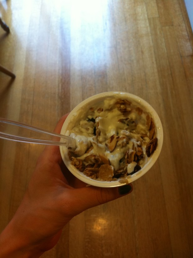 Peach Chobani with coconut almond granola. FYI: this gave me THE worst tummy ache 😦 I hate not being able to digest lactose waaaaa