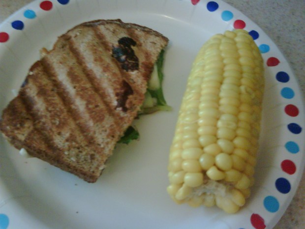 Post leg workout snack: Grilled veggie panini with mozzarella cheese and corn on the cob!