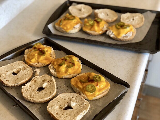 For lunch sandwiches, I pick some sort of sturdy bread product like a bagel, wrap, hearty bread, or bun. When I made the batch of sandwiches pictured in this post, I used everything bagels and pretzel bread.