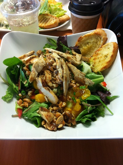 Panera Bread! I usually get the fuji apple chicken salad but I heard the Thai chopped chicken salad was pretty spicy so I decided to try it. It IS spicy, but in a good way! I couldn’t taste anything for like an hour after though :p.