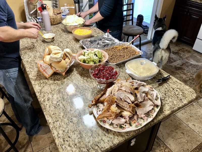 We had a traditional Thanksgiving dinner with turkey, mashed potatoes, corn, stuffing, sweet potato casserole, apple pie, and a few other sides.