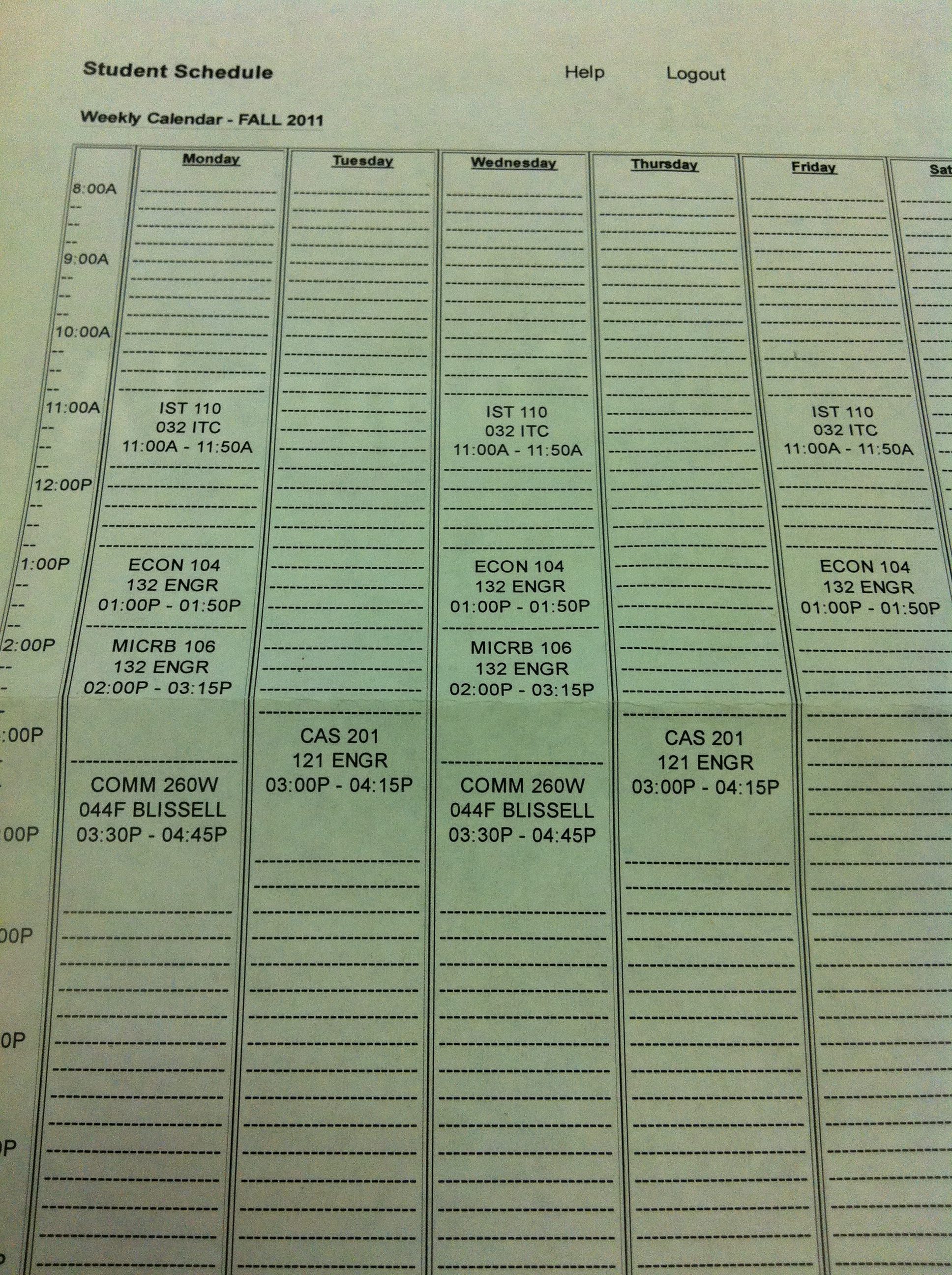 My Monday and Wednesday’s basically stink. I have IST (a computer class), Economics, Microbiology, and News writing. 2 of the classes are an hour and 15 minutes and two of the classes are 50 minutes. Luckily I have a break so I can eat lunch!
