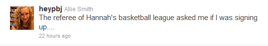On Thursday night I drove my 13 year old sister to one of her first basketball practices of the season for the middle school league she is in. The referee saw Hannah and I walk in and asked if we were signing up. What? I was so confused and he asked me again. Then I told him I was 19. He didn’t believe me. Crazy!