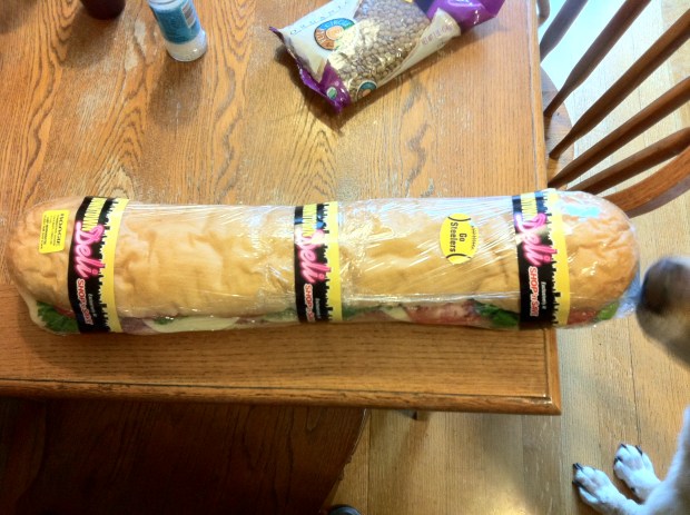 A huge sub/hoagie (what do you call it?!) from the store filled with tomato, lettuce cheese, and deli meat.